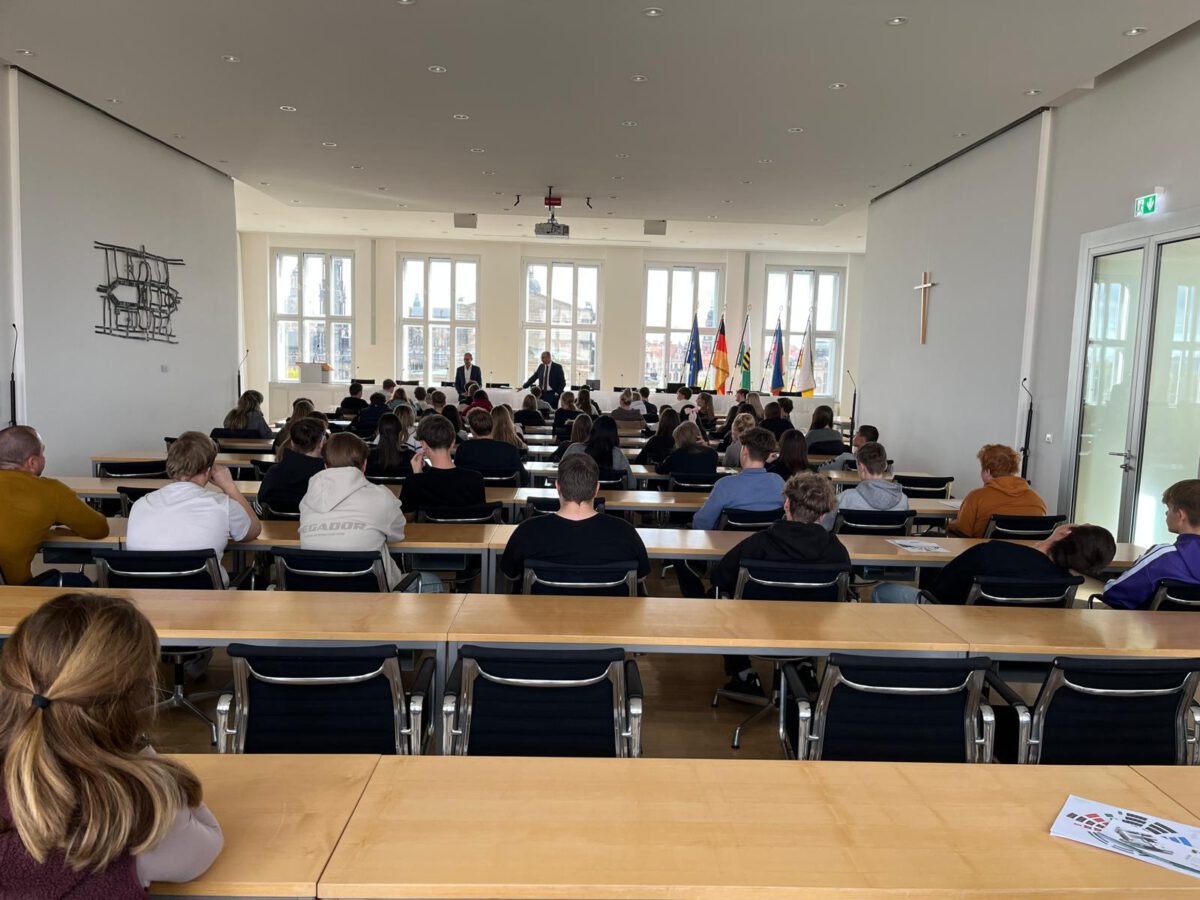 Um den Landtag kennenzulernen, gab es zuerst eine kleine Führung durch das Gebäude. Danach konnten die Schülerinnen und Schüler von der Besuchertribüne im Plenarsaal das stattfindende Plenum verfolgen.