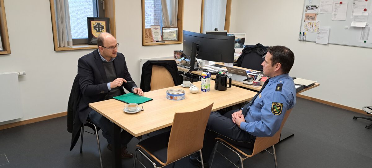 Das neue Polizeirevier konnte ich schon 2025 besichtigen, daher tauschten wir uns in seinem Büro vor allem über die Kriminalitätsrate in Leipzig aus und welche aktuellen Themen das Polizeirevier beschäftigen.